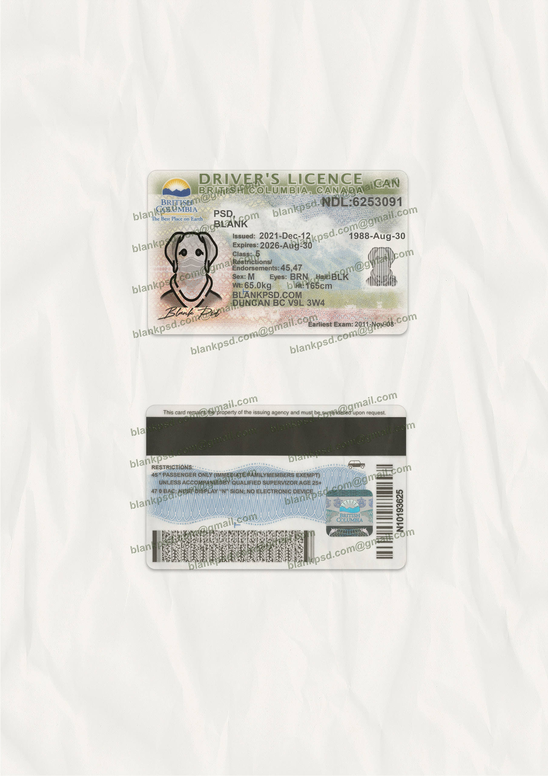 You can edit BC Drivers License Psd and put any : name, address, Id number, expire date, barcode, date of birth, height, weight, expire date, change photos..etc.