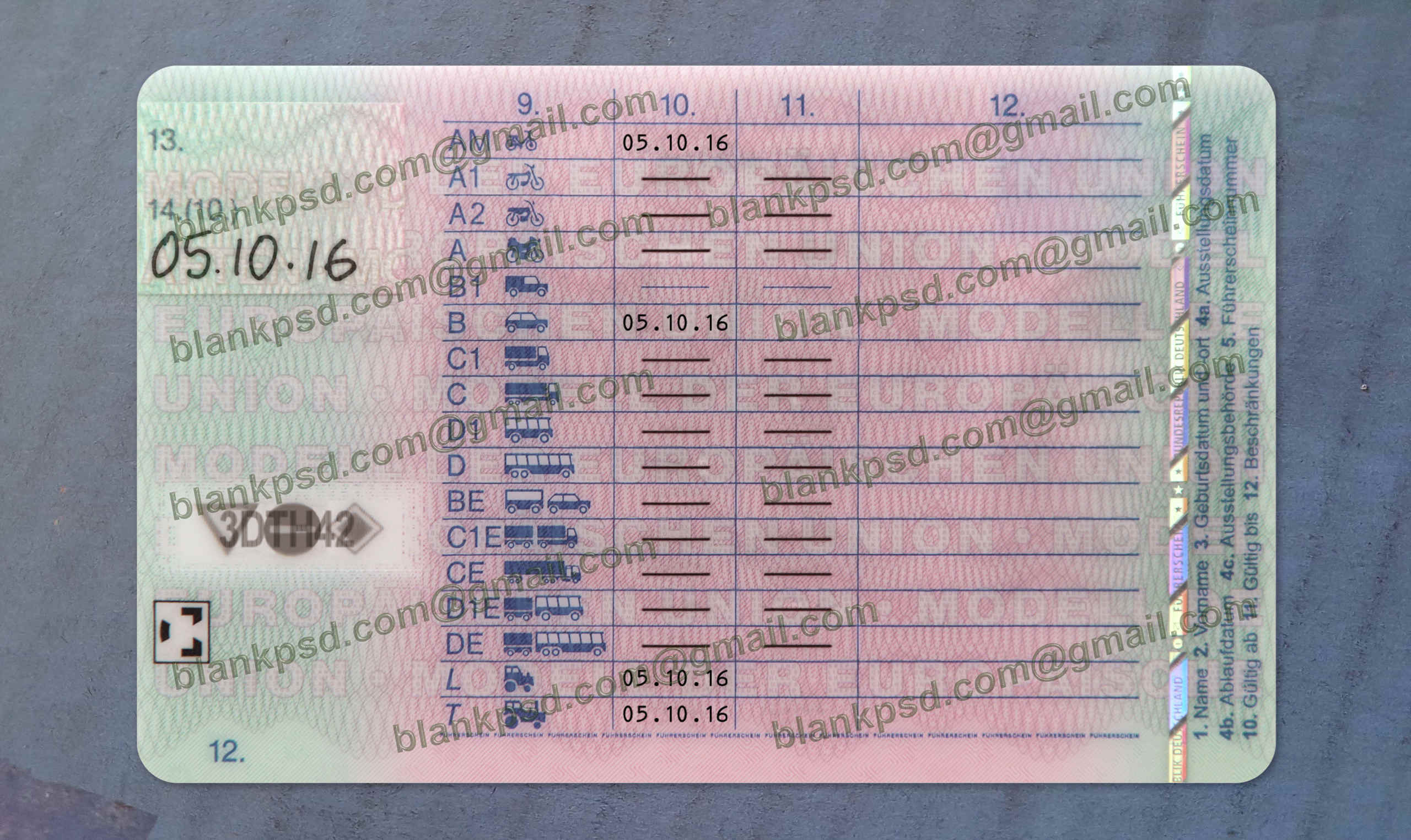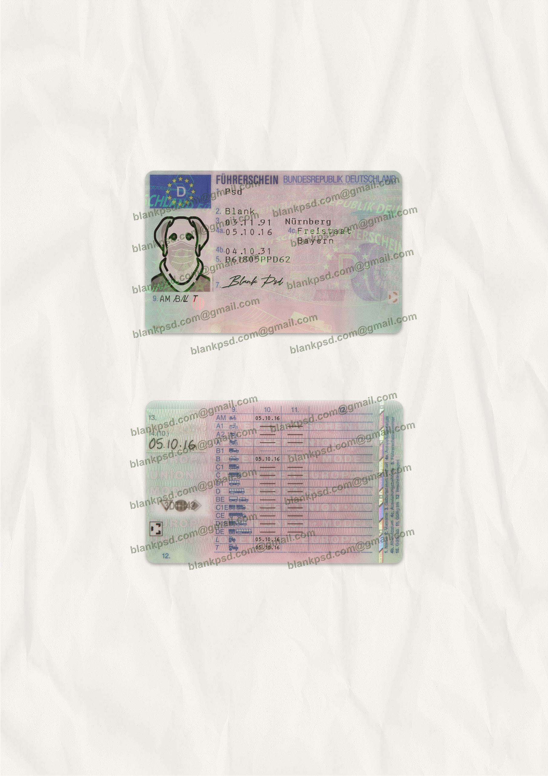 You can edit German Driving Licence Template and put any : name, address, Id number, expire date, barcode, date of birth, height, weight, expire date, change photos..etc.