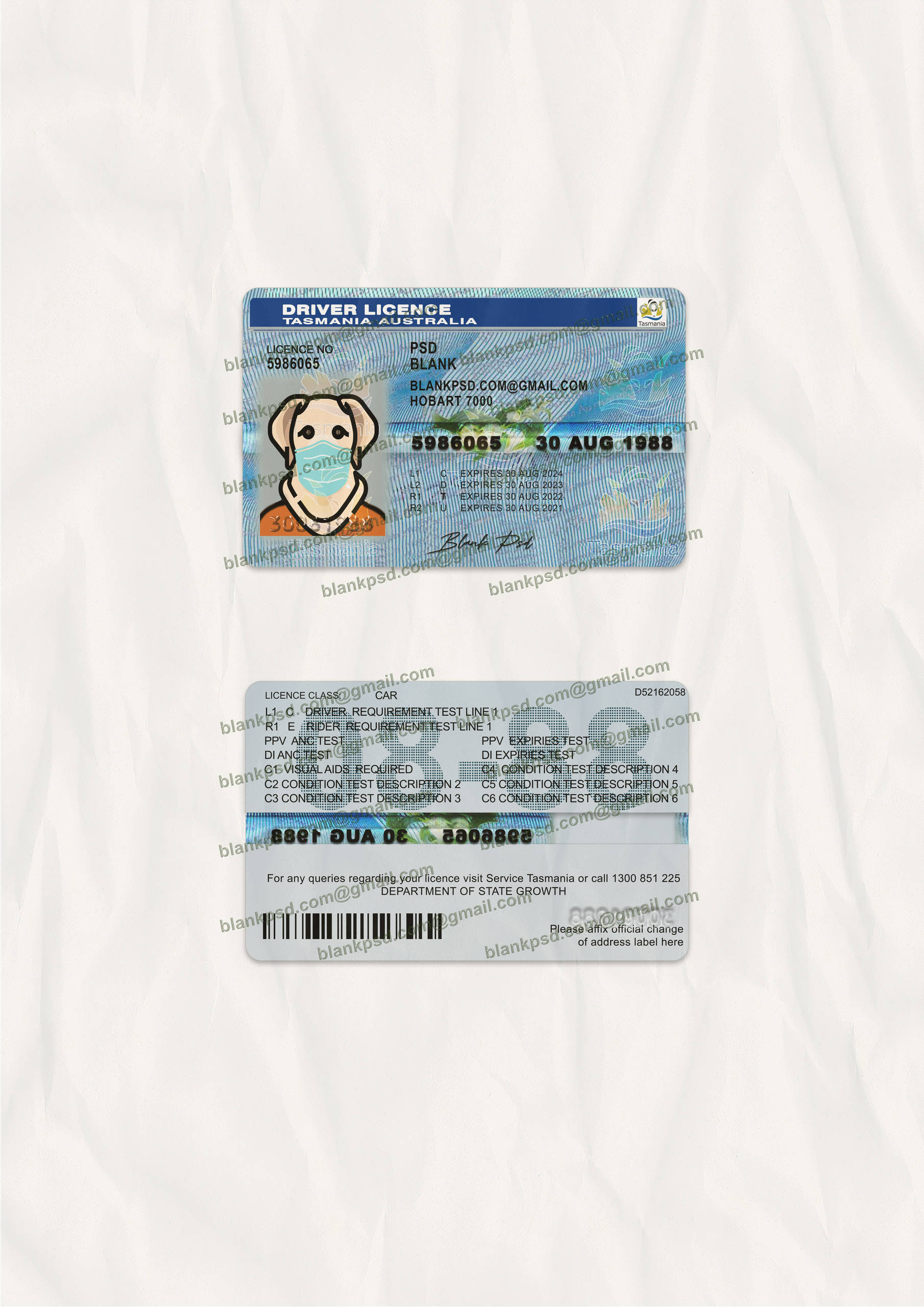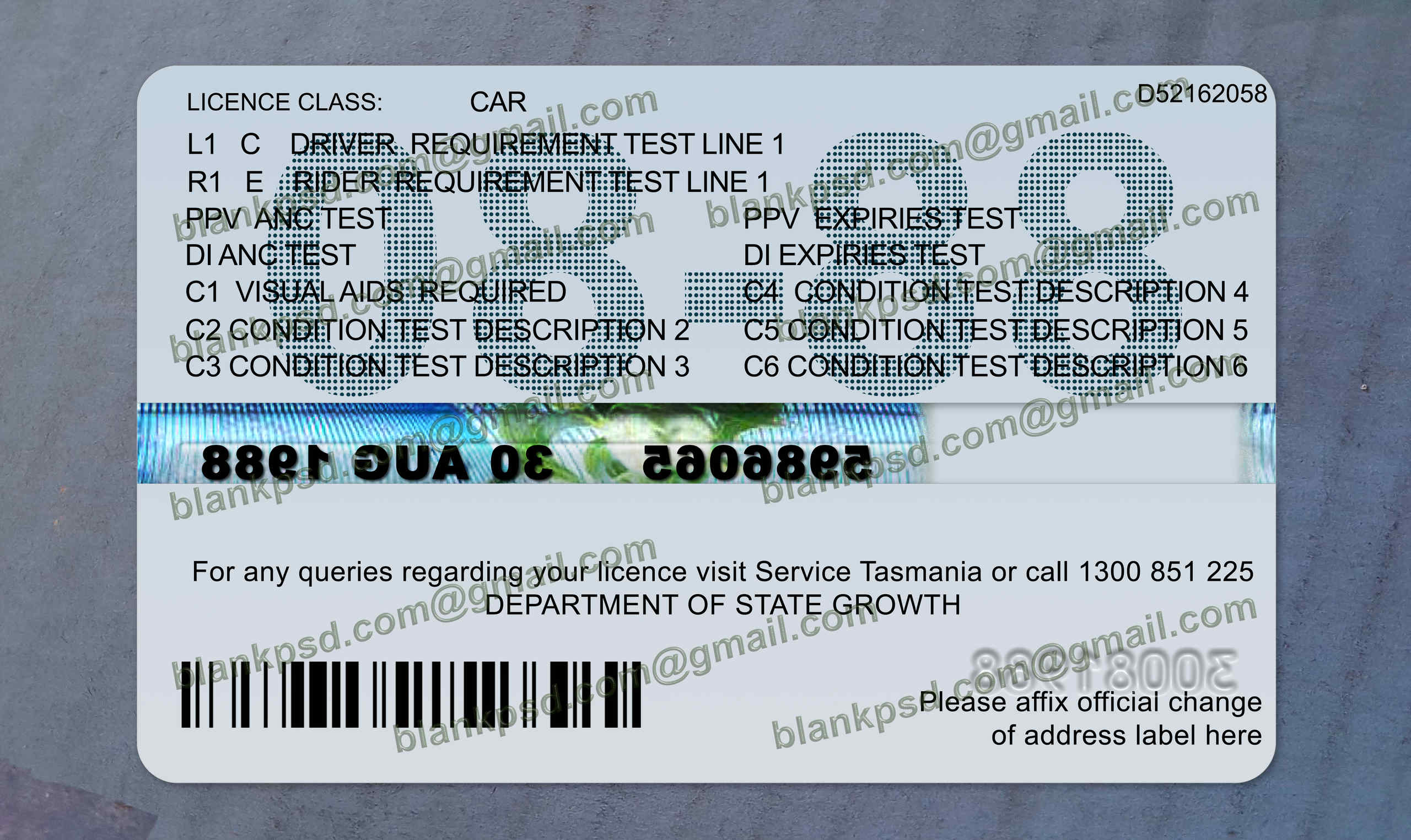 You can edit Tasmania Australia Driving Licence Psd and put any : name, address, Id number, expire date, barcode, date of birth, height, weight, expire date, change photos..etc.